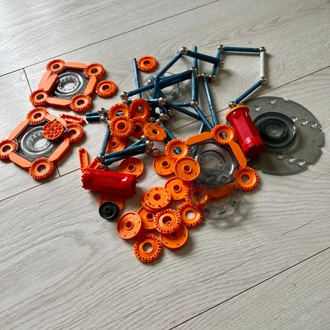 Geomag magnetisk byggesæt dele i rød og sort farve. Sættet indeholder stænger og kugler til konstruktion af forskellige former og strukturer. Materialerne er magnetiske metaldele designet til kreativ leg og læring.