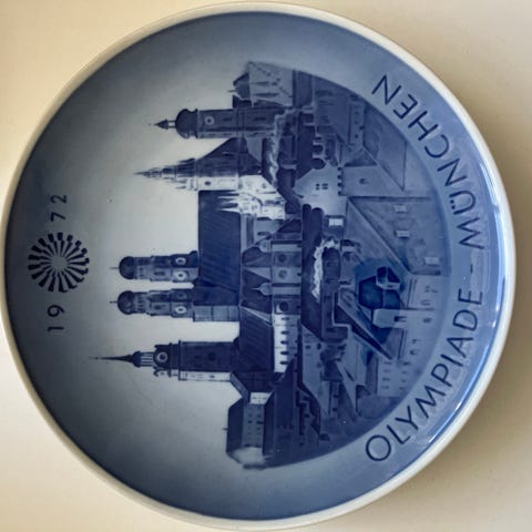 Royal Copenhagen platte der markerer Olympiaden i München 1972 i porcelæn med blå og hvide farver. Platten viser et motiv fra München og er dekoreret med traditionelle blåmalede detaljer.