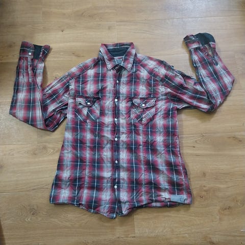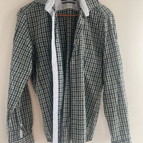 skjorte til mænd i størrelse L. Skjorten er sort og lavet af bomuld og har tryk knapper. Den har kortærmede design og ternet mønster.