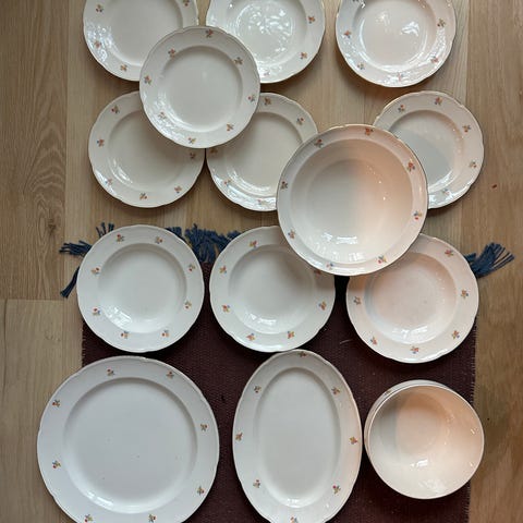 Tallerken af fajance fra Aluminia, Royal Copenhagen "Anna Sofie" stellet designet af Nils Thorsson. Fra 1940’erne.