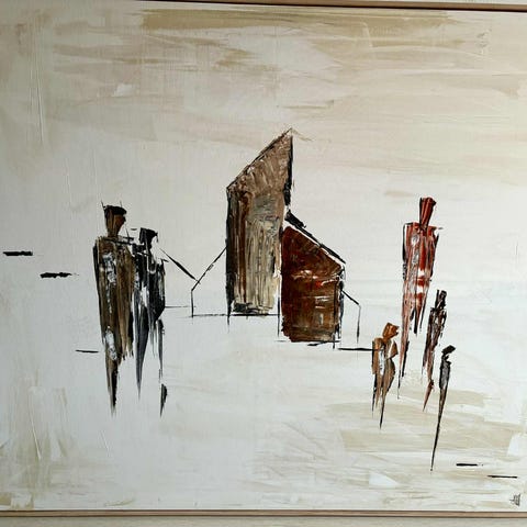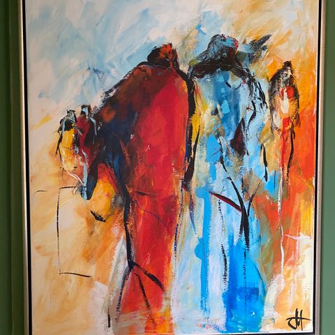Flot oliemaleri af Henrik Busk Andersen, i lyse pastelfarver, monteret med hvid ramme i træ, maleriet, måler 80 x 100, mål er excl. ramme, er fra ikke ryger hjem.