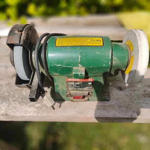 Cromag bænksliber med slibeskive og skærpesten. Maskinen er fremstillet i metal og har elektrisk tilslutning. Velegnet til slibning og skærpning af værktøj og metaldele.