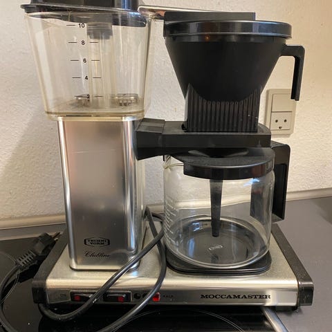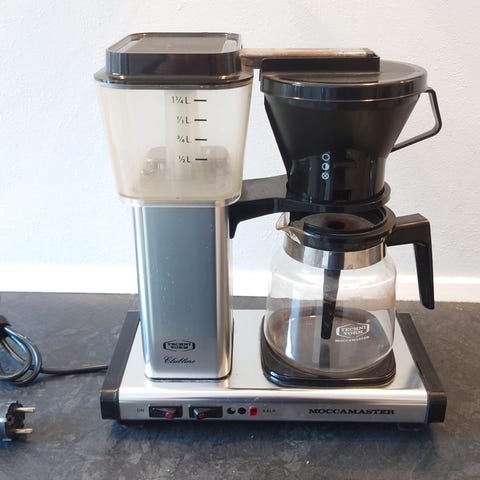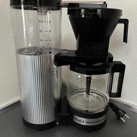 Moccamaster Technivorm KG kaffemaskine med en kapacitet på 1,25 liter. Trænger til nyt låg på filtertragten, og der er gået en lille flig af håndtaget på kanden, men maskinen er fuld funktionsdygtig. Nye reservedele kan købes på bl.a. hvidevareshoppen.dk, reservedele.nu og proshop.dk