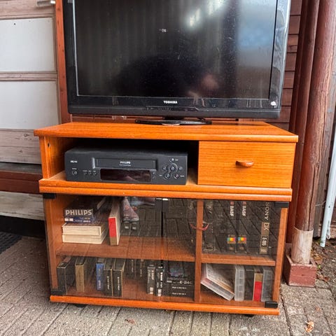 Velholdt teak møbel fra 60’erne påmonteret ben i massivt træ. Møblet kan f.eks. anvendes som TV-møbel, sengebord, entremøbel m.m..