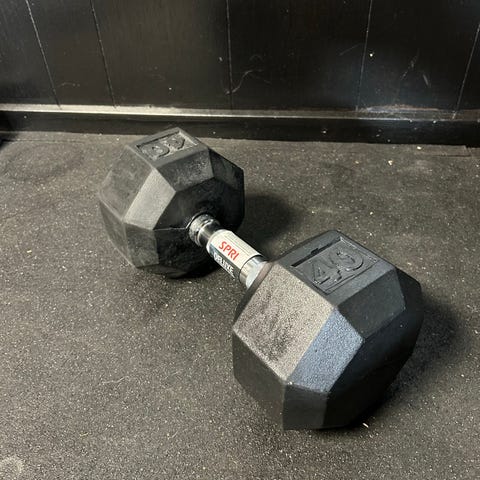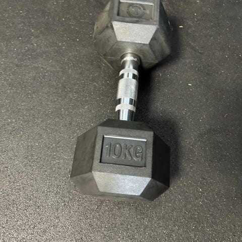 De konturerede håndtag med blød overflade giver et sikkert greb, også når hænderne bliver svedige. Den sekskantede form ligger stabilt på gulvet, så vægtene ikke ruller fra dig under øvelser som renegade rows. Overfladen hjælper samtidig med at skåne gulvet.
