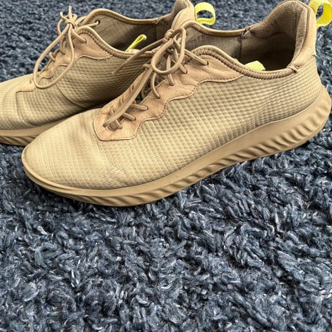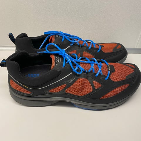 ECCO Sneakers i størrelse 48. Skoene er designet til komfort og holdbarhed, velegnede til daglig brug. Farven er primært sort med grønne detaljer på sålen. Materialet kombinerer tekstil og syntetiske elementer for åndbarhed og støtte.