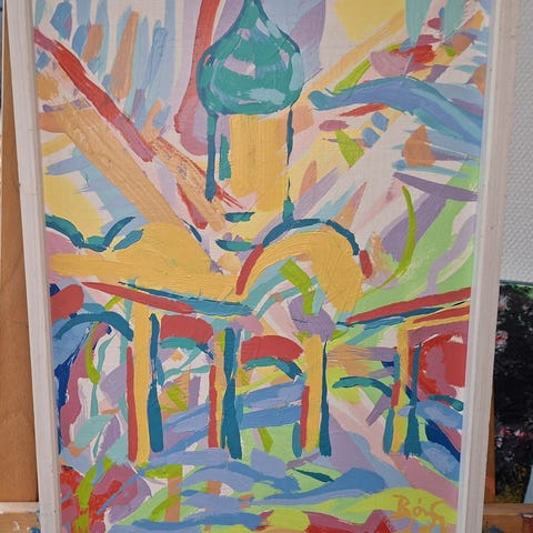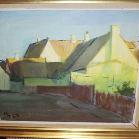 Fint oliemaleri i friske farver monteret med sort svæveramme. Maleriet måler 40 x 40, mål er excl. svæveramme. kan sendes