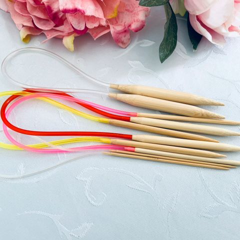 Bambus rundpinde med en længde på 80 cm. Pindene er lavet af bambus og har fleksible ledninger i grøn og blå farve. Velegnet til forskellige strikkeprojekter.