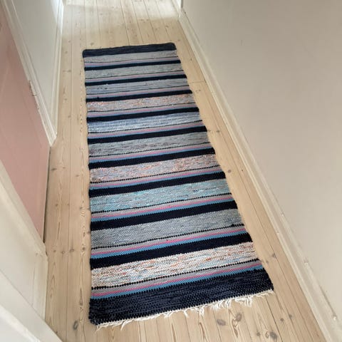 Flot kludetæppe i fine farver. Håndvævet. 210 cm. lang/Bredde 66 cm.