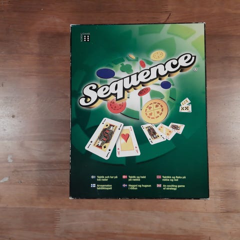 Sequence brætspil med spillekort, spillebræt, spillebrikker i forskellige farver og spillevejledning. Spillet kræver strategi og er egnet til flere spillere.