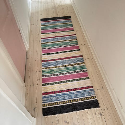 Smukt kludetæppe med et stribet mønster i forskellige farver. Måler ca. 71 cm x 210 cm