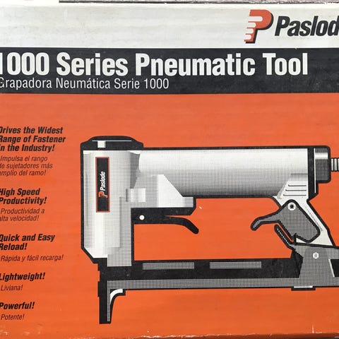 Paslode IM100 Søm pistol i orange med tilhørende kuffert. Produktet indeholder en batterilader. Velegnet til brug i bygge- og tømrerarbejde.