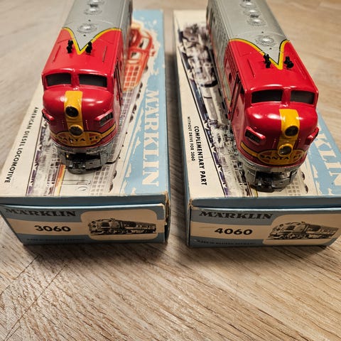 Märklin 3129 + 4129, amerikansk Southern Pacific, analog, velfungerende og i rigtig pæn stand. Tilhørende caboose 4563 medfølger. Alt er i originale æsker. Samlet fast pris 950kr. Kan ombygges til digital drift mod merpris på 400kr. Sender gerne (50kr til GLS shop). Se også mine andre annoncer med modeltog.