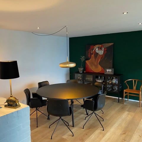 Super hyggeligt rundt spisebord fra snedkergården. Bordet er laminat. Ideelt til hyggelige sammenkomster. Benene kan skrues af. Hvis du er interesseret i at tilkøbe stolene, kan vi finde en god pris på det