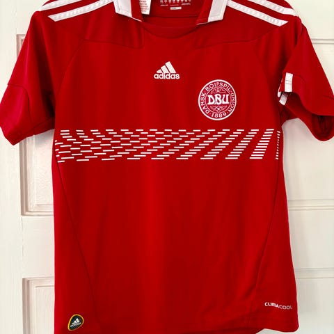 Original DBU Dansk Boldspil-Union landshold Fodboldtrøje i rød farve, børnestørrelse 152. Trøjen er designet til fodbold og har officielle autentiske detaljer.