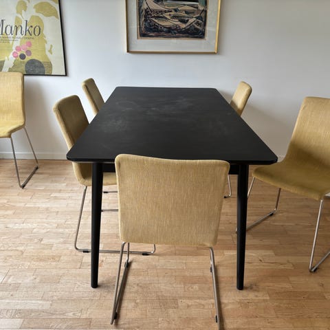 5 behagelige spisebordsstole; 3 sorte og 2 grå. Armlænet er lakeret træ, hvor de to grå stole er forskellig type træ. Den ene stol er misfarvet i sædet. Alle 5 stole er lette at ompolstre.
