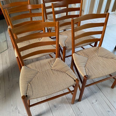 6 stk Kaare Klint kirkestole i rød med gjord. Trænger til en kærlig hånd (skrammer, slidte gjorde, løse samlinger)
