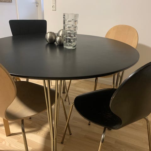 Jeg sælger mit utrolig smukke spisebord (Ø105 cm) inkl. stole, da det desværre fylder for meget i min lille lejlighed og jeg sjældent bruger det, så det tager endelig bare pladsen.