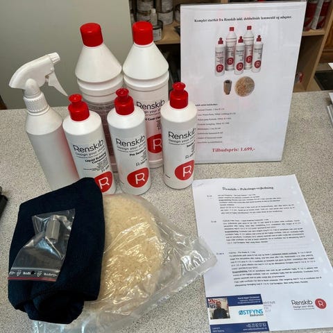 Gør klar til den kommende sejlersæson med en komplet samling af Renskib produkter. Består af 3 helt nye og ubrugte produkter i form af 1 liter af hver af "Gel Coat Cleaner", "Shampoo" og "Teak Cleaner", samt en ny 0,5 liters R-120 Liquid Rubbing Compound, en 60% fyldt Pre Sealer A og en 80% fyldt Sealer B. Endvidere medfølger en plastlamineret brugsanvisning om anvendelsen. Kan afhentes i Espergærde eller på Amager (Strandlodsvej). sælges samlet.