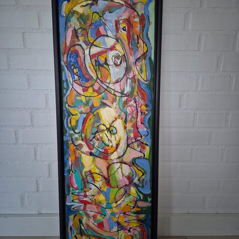 Abstrakt maleri med integreret lysfunktion, der skifter farve og fremhæver forskellige mønstre og detaljer i værket. Maleriet består af flere sektioner med levende farver som rød, blå, pink og grøn, der ændrer sig ved brug af lys. Velegnet til dekorativ brug i hjem eller kontor, hvor visuel effekt og stemningsbelysning ønskes.