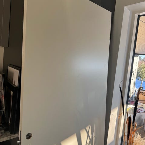 Indvendig hvid dør i fin stand. Skal bæres ned fra 5 sal.