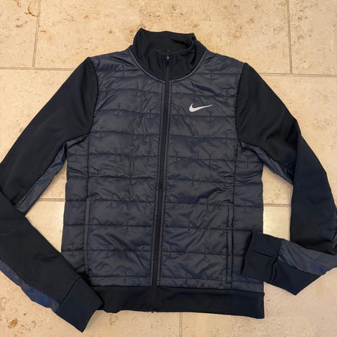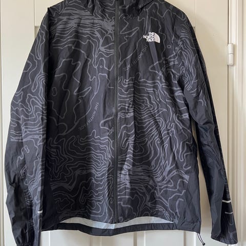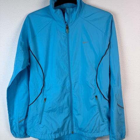 The North Face løbejakke / træningsjakke til kvinder i størrelse L. Jakken er lyseblå med sorte detaljer, designet til løb. Den har lynlåslommer foran og er fremstillet i materiale egnet til sportsbrug.