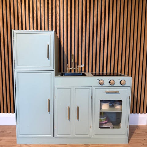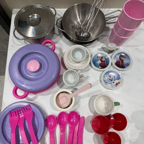 Disney Frost legekøkken til børn med tilbehør som gryder, pander, redskaber og ovn. Køkkenet har en kombination af blå, hvide og lilla farver og er designet til leg og rolleleg inspireret af Frost-temaet.