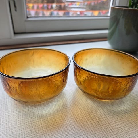 To keramiske skåle i blå og grå farver med unikt mønster. Skålene har en rund form og er velegnede til servering eller morgenmad.