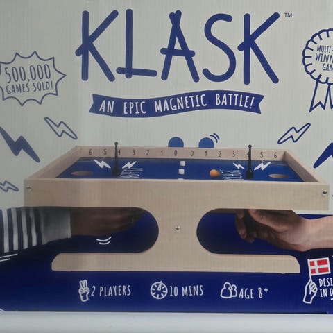 Klask spil kombinerer airhockey med finmotorik og nogle små taktiske elementer fra fodbold. I Klask går det ud på at score flere mål end dine modstandere ved at skubbe den gule kugle ned i modstanderens mål.