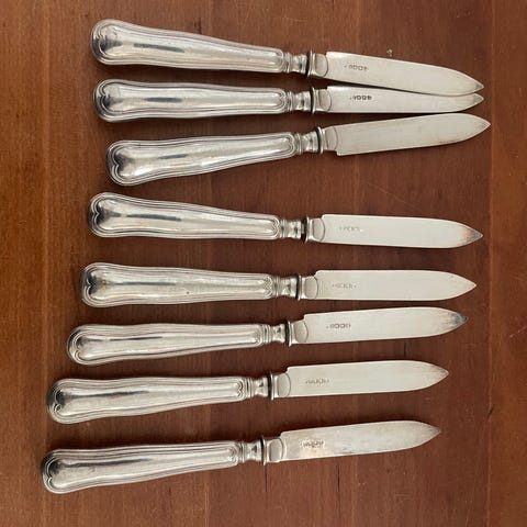 Frugtkniv med sølvhåndtag i tretårnet sølv 52 g