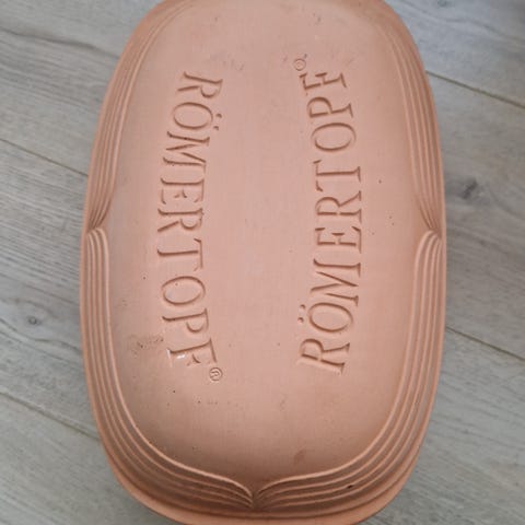 Römertopf brødform i stentøj. Brødformen består af to dele, en bund og et låg, som begge er fremstillet i terrakottafarvet stentøj. Egnet til bagning og tilberedning af brød i ovn.
