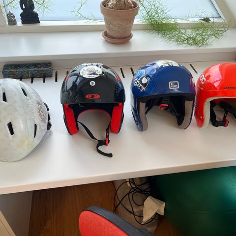 Junior ski-hjelme og briller i størrelse XS (48-52 cm) grå og sorte. Der er justerbar strop og polstring indvendigt for god komfort.