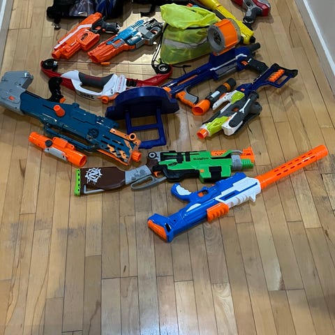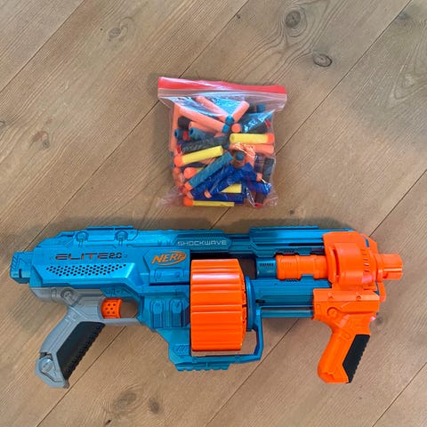 Nerf legetøjsgeværer med flere modeller og farver, inklusive 7 forskellige geværer. Sættet indeholder også en stor mængde skud til brug med geværerne. Egnet som legetøj til børn.