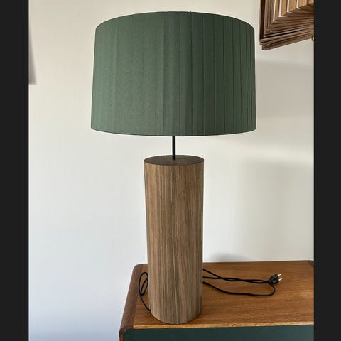 Stand fra Ferm Living med mørkegrønt lampeskærm fra Santa Cole.