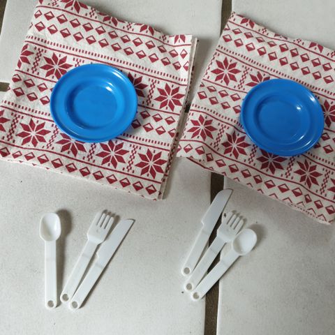 Blandet service til legekøkken, fx. kaffesæt og små tallerkener. Diverse bestik og værktøj til gryder