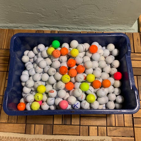 Diverse golfbolde i forskellige farver og materialer. Indeholder et stort antal bolde, primært i gul farve, samt enkelte i hvid, orange og sort. Velegnet til golftræning eller spil.