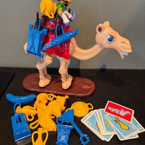Ali Baba og hans dromedar spil. Spillet inkluderer Ali Baba, dromedar, sadel, 15 stk bagage samt 20 kort, samt vejledning. Hvilket betyder spillet er intakt - spillet kommer i tilhørende kasse.