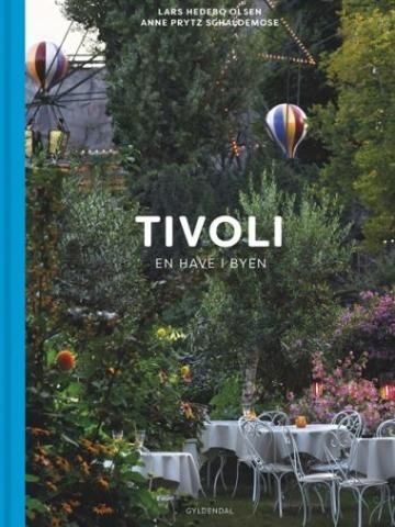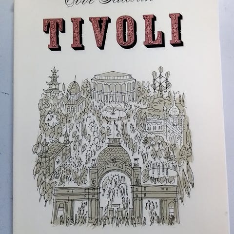 Ebbe Sadolin Tivoli bog med illustreret forside og indhold. Indeholder detaljerede tegninger og tekst om Tivoli. Bogens omslag har et mønstret design i grønne og hvide nuancer. Sender ikke for køb under 200 kr.