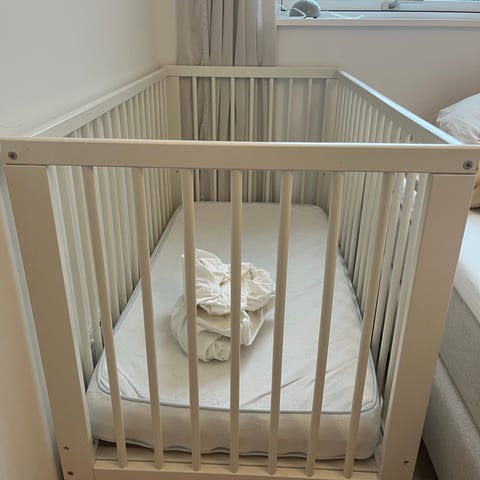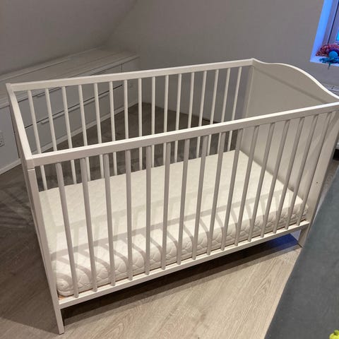 Klassisk hvid tremmeseng fra IKEA med ny madras. Madras fra Jysk, som er forsøgt brugt en gang til middagslur (barnebarn), men han ville ikke sove i den