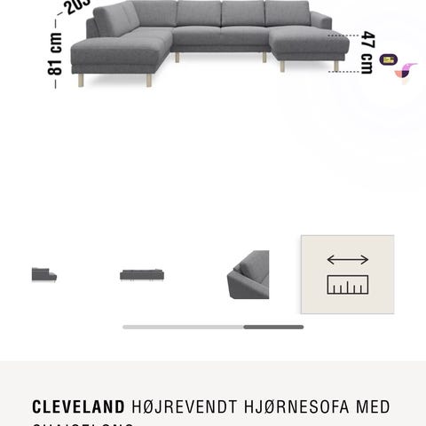 Mørkegrå, venstrevendt hjørnesofa med chaiselong og justerbare nakkestøtter hele vejen rundt.