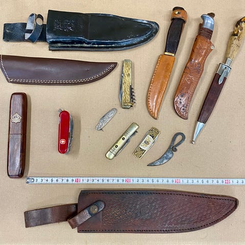 Stor kniv/jagtkniv til salg. Schweizerkniv og dåse til reference:)
