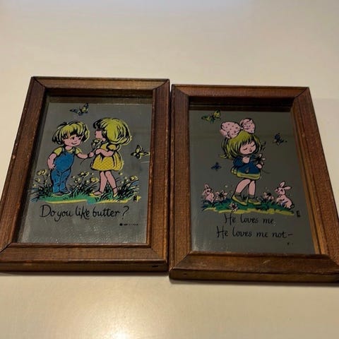 Samling af vintage træplader med malede motiver. Pladerne har forskellige runde illustrationer, der kan bruges til dekoration eller samlerobjekter. Farverne og motiverne varierer på hver plade.