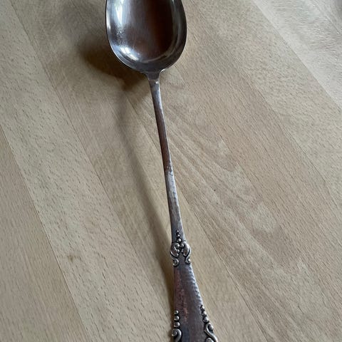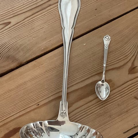 Suppeøse/suppeske i sølv med dekorativt håndtag og rund skål. Suppeskeen er velegnet til servering af suppe og andre retter. Designet har klassiske detaljer og er fremstillet i tretårnet sølv.