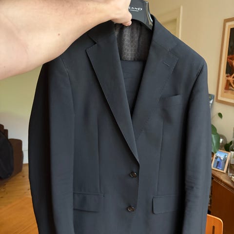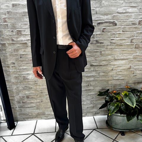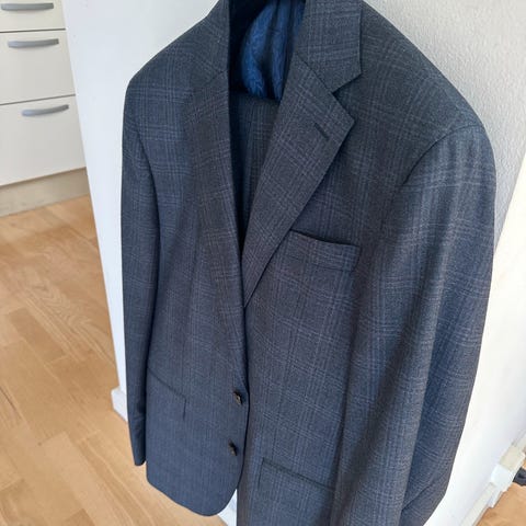 SAND Copenhagen jakkesæt til herre i størrelse XL. Jakkesættet er sort og består af jakke og bukser. Jakken har en foret inderside med mønster og to knapper foran. Materialet er uldblanding, hvilket giver holdbarhed og komfort.