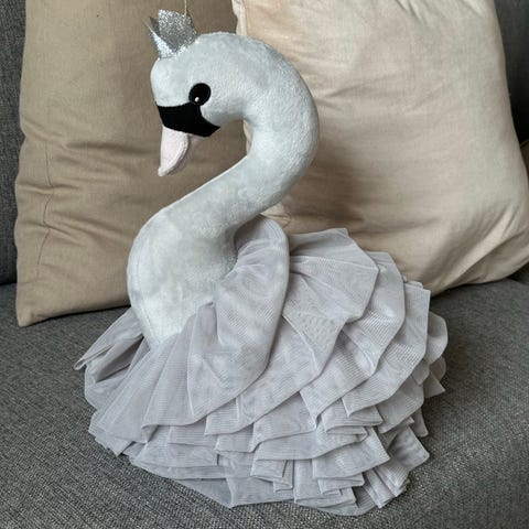 Stor svanebamse, ca 50X40 cm, med gyldne detaljer. Fremstillet i blødt materiale.