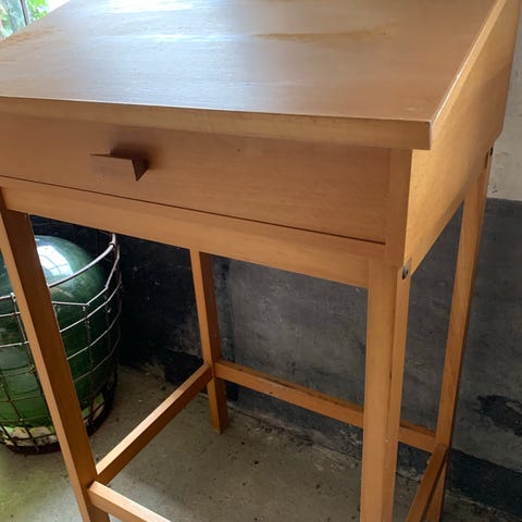 Træ pult i sort og brunfarve med låg og en skuffe. Træ pulten er af ældre dato har en firkantet form og er velegnet til opbevaring af små genstande., kun fantasien sætter grænser Materialet er træ med en kombination af sort maling og brunlig stof finish.