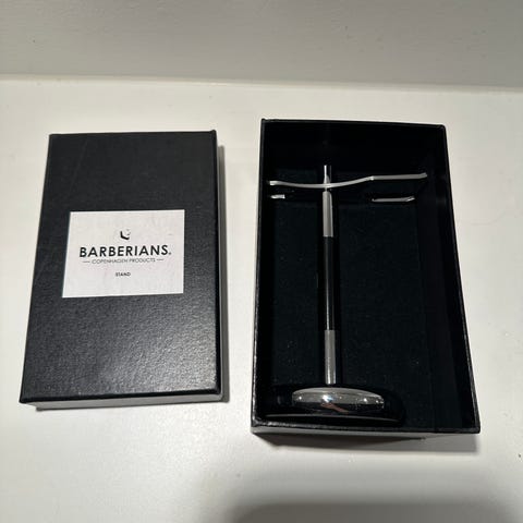 Barberians Safety Razor i sort og metal med tilhørende opbevaringsæske. Barberingsredskabet er designet til sikker barbering og leveres i en sort kasse med branding.