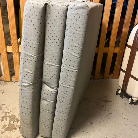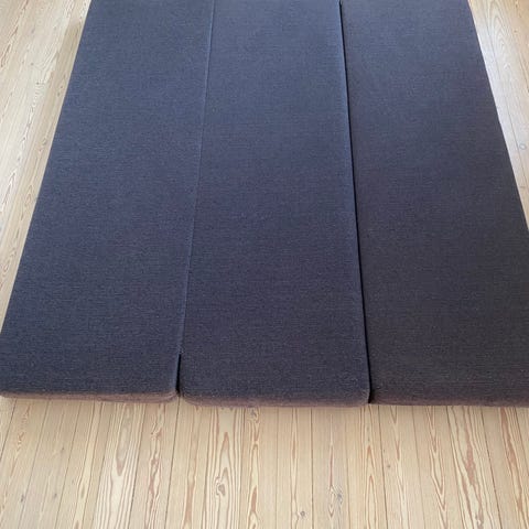 Fra ikke-ryger hjem. Brugt som ekstra madrasser i hyggekrog. Den ene madras har nogle trådeudtræk der kan trækkes ind eller klippes. Begge har en lille smule fnuller.