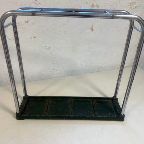 Antik paraplystander i støbejern med dekorative detaljer og creme finish. Standeren har plads til flere paraplyer og er velegnet til opbevaring i entré eller gang. Kan også fint bruges til andre formål som stokke eller papir/plakat ruller