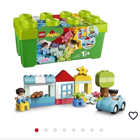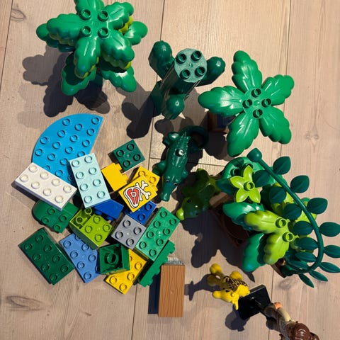 LEGO DUPLO 5538 byggeklodser i forskellige farver og størrelser. Sættet er egnet til børn i alderen 2-5 år og leveres i en grøn plastbeholder med låg til opbevaring. Klodserne er designet til at stimulere kreativ leg og motoriske færdigheder.